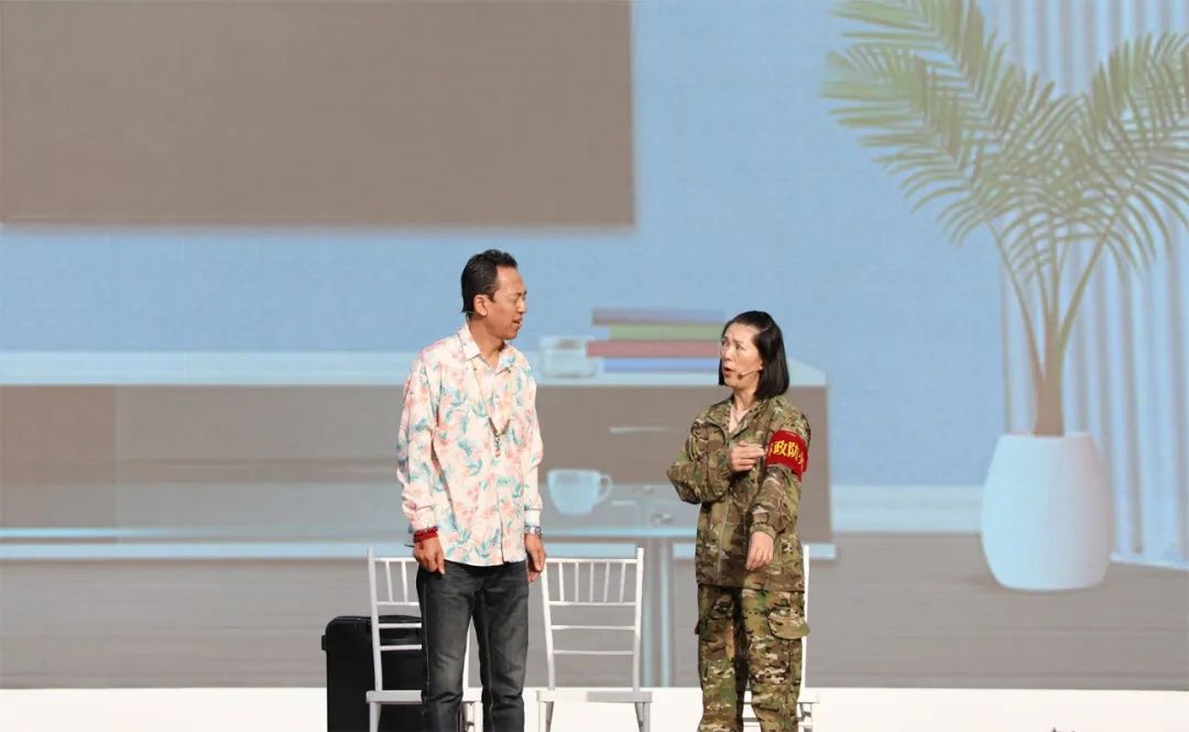 殷秋华(左)与男高音歌唱家陈小涛(右)一起表演歌曲《变脸》并与现场观众互动。王楠 摄