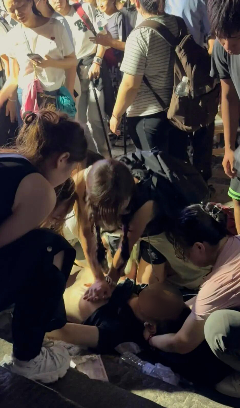 夜爬泰山的人群中突然传来一声惊呼,一名男性游客突然倒地,瞬间失去意识。就在大家手忙脚乱之际,一个身影挤了过去,跪地、判断、为患者做心肺复苏、人工呼吸……直至等来救援人员。