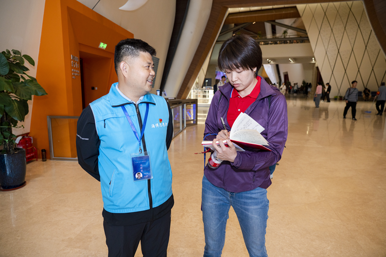 记者还看到在场馆内活跃着这样一群身影——他们身穿蓝色马甲,为观众提供更深入、更丰富的参观体验,帮助观众更好地理解和欣赏博物馆的展品。据国家海洋博物馆相关负责人介绍,在报名的2000多份志愿者申请表中,经过筛选培训,最终形成了现在100多人的志愿者队伍。