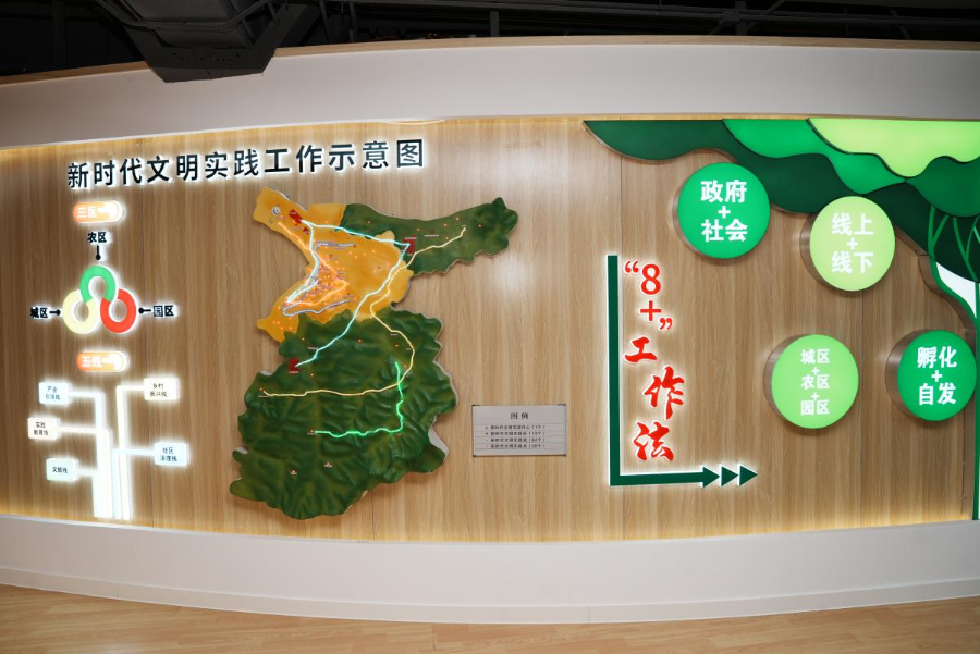 赤峰市红山区新时代文明实践中心内展示的“三区五线八加工作法”。新华网发(赤峰市融媒体中心记者 孙雁南 摄)