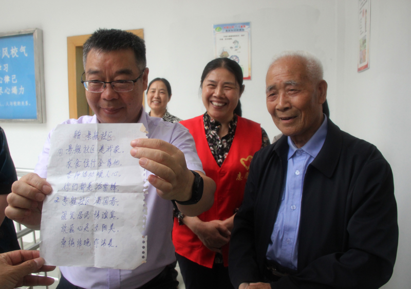 “景航社区是我家,衣食住行全靠他,各种活动暖人心,你们都是活雷锋。”“景航社区满园春,银发居民情谊真,放飞心灵夕阳美,桑榆非晚作清晨。”在景德镇市昌江区西郊街道景航社区新时代文明实践站,90岁高龄的赵国田大爷,热爱各种乐器,对生活充满热情,见到记者,大爷激动不已,拿出了自己亲手写下的两首小诗,来表达对社区的喜爱以及对文明实践站工作人员的感激之情。
