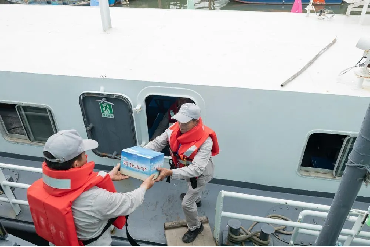 骨灰集中撒海前,工作人员将逝者骨灰转移至海葬专用船,代逝者家属寄托哀思。